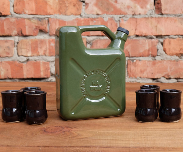 Пляшка — як справжня каністра, у наборі із шістьма чарками.